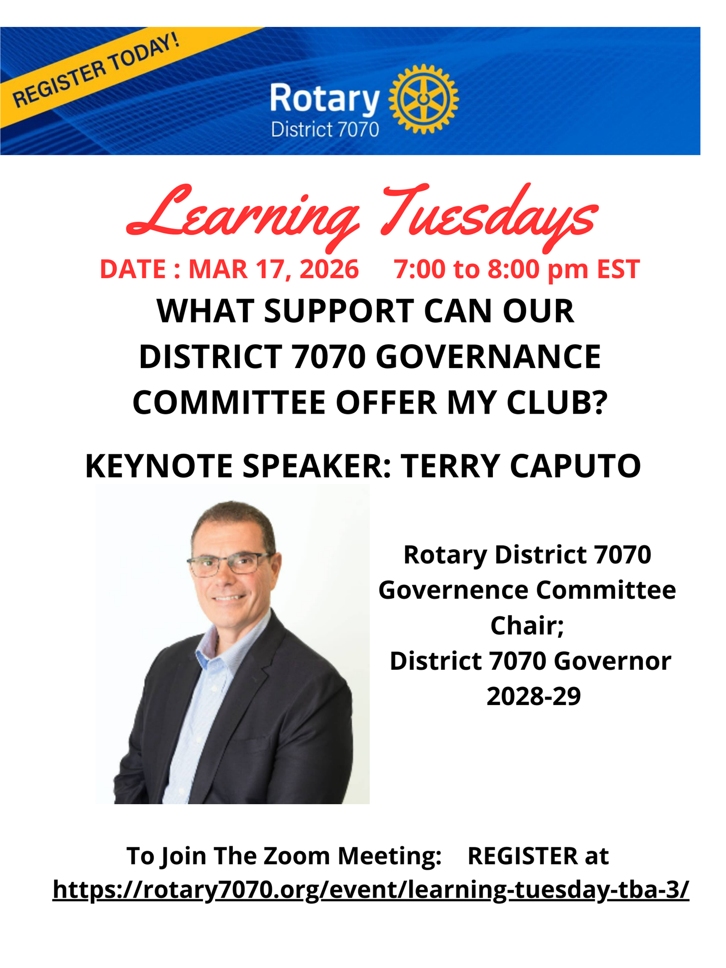 Join Rotary District 7070Governance Committee Chair Terry Caputo on march 17, 2026 from 7 to 8 pm on Zoom. Go to the District 7070 Calendar for march 17 and REGISTER TODAY.