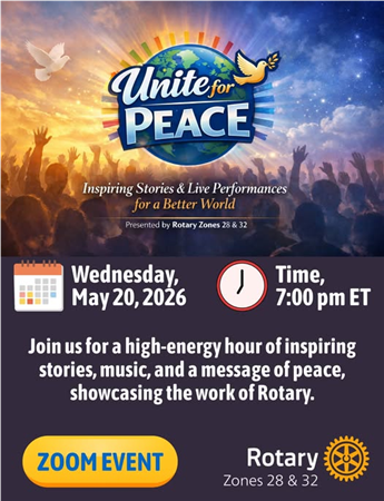 On May 20, you can learn more in a special on-line presentation “Unite for Peace”– a high-energy hour of stories, music and more, showcasing the peacebuilding work of Rotary through our commitment to create lasting change that enhances international relationships, improves lives and communities, and creates a more peaceful world.