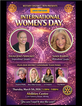Rotarians from all over Rotary District 7070 embraced women in our District as leaders, as we celebrated the Women’s Day of Rotary District 7070. March 5, 2026, at the Abilities Centre, in Whitby, Ontario Canada, hosted by Rotary District 7070 GovernorNiecy Dillon-Tyrovolas. We celebrated a fundamental truth within Rotary: when we support the agency and leadership of women, we strengthen the foundation of every community. This day is more than a celebration—it is a call to continue our work to remove barriers, elevate women’s voices, and expand access to leadership and service. “Unite for Good” isn’t just a theme — it’s how we move forward. TOGETHER. If you believe in connection, courage, and building something bigger than yourself…This is your room. These are your people. This is your moment. ..... Please read more.....
