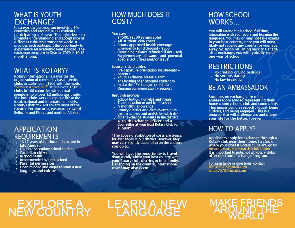 Promote the Program in your local high school (brochure attached). The Program is geared to adventurous 16-17 years old students who are typically in Grade 11. We will be holding an information session early in the Rotary year and we will also provide a ZOOM link for the session for parents and students that can not attend in person.