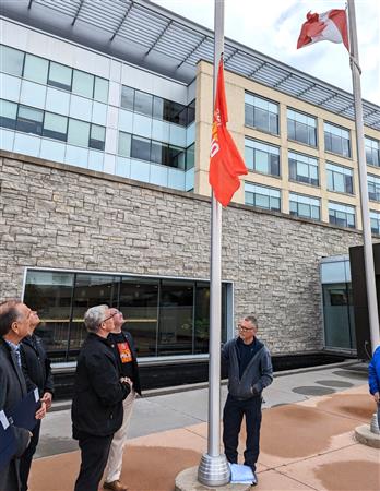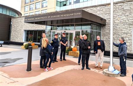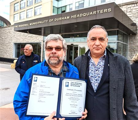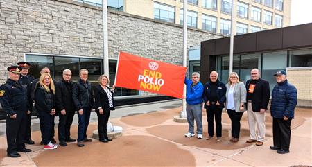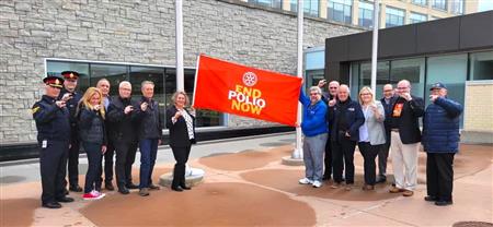 October 24 was proclaimed World Polio Day, in the Regional Municipality of Durham in Ontario Canada, in District 7070, in south central Ontario by Durham Region Chair and fellow Oshawa Rotarian John Henry. Rotarians from the 11 Rotary Clubs in Durham region joined together for the celebration at Durham Region Headquarters on Rossland Road in Whitby, Ontario Canada on October 17, 2022 for the proclamation and End Polio Now Flag Raising. Club of Oshawa-Parkwood Past President Dave Andrews for the photos.