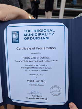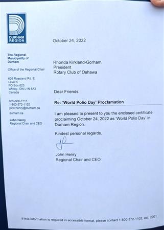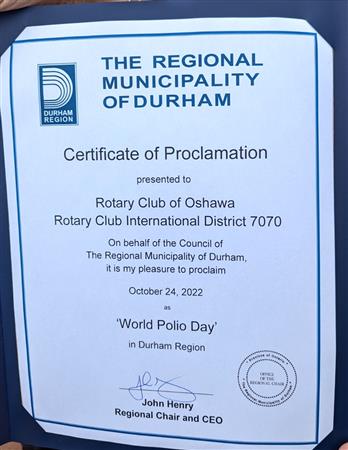 October 24, 2022 Proclaimed World Polio Day in Durham Region
